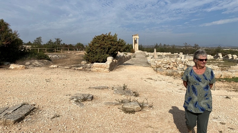 Excited to see the Sanctuary of Apollo Hylates near Kourion. From the 8th century BC to the 4th century AD. Dedicated to Apollo as protector of woodlands, it featured a temple, altar, circular monument, and votive pits filled with offerings. Its ruins, columns, courtyards, and surrounding structures reflect centuries of worship, ritual, and community devotion to Apollo’s guardianship. The main structure, recently recreated and towering in the background, is amazing and we remember being here before, due to that.