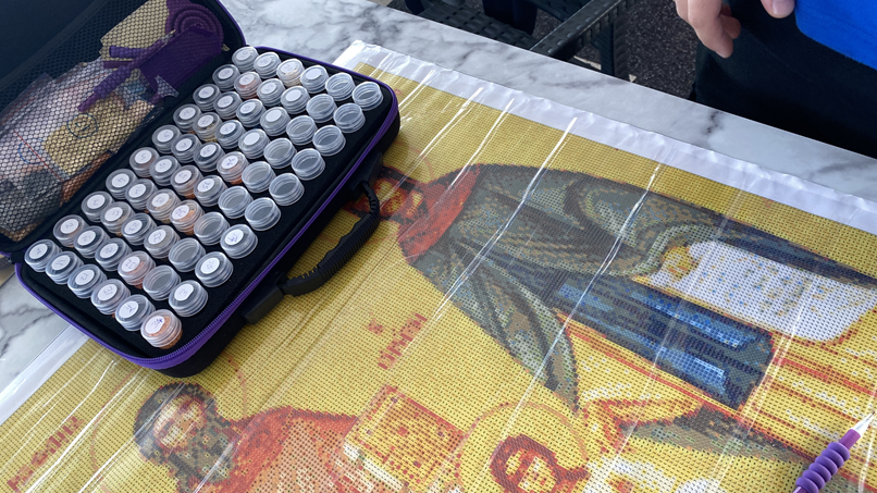 At our favourite beach café, they have a charming sideline: Creating mosaic kits. The image shows part of a design for you to follow as you make your mozaic. They have a list of how many pieces of each colour are needed to complete the mosaic. The café staff then carefully use tweezers to count out the right number of tiles from large containers and place them into the smaller pots you see in the case they are preparing and identify the colour with a number. On the edge of the image there is a chart showing all the colours and the associated number. Once everything is counted, the kit is ready to be sold. It is probably the actual size of the finished object.