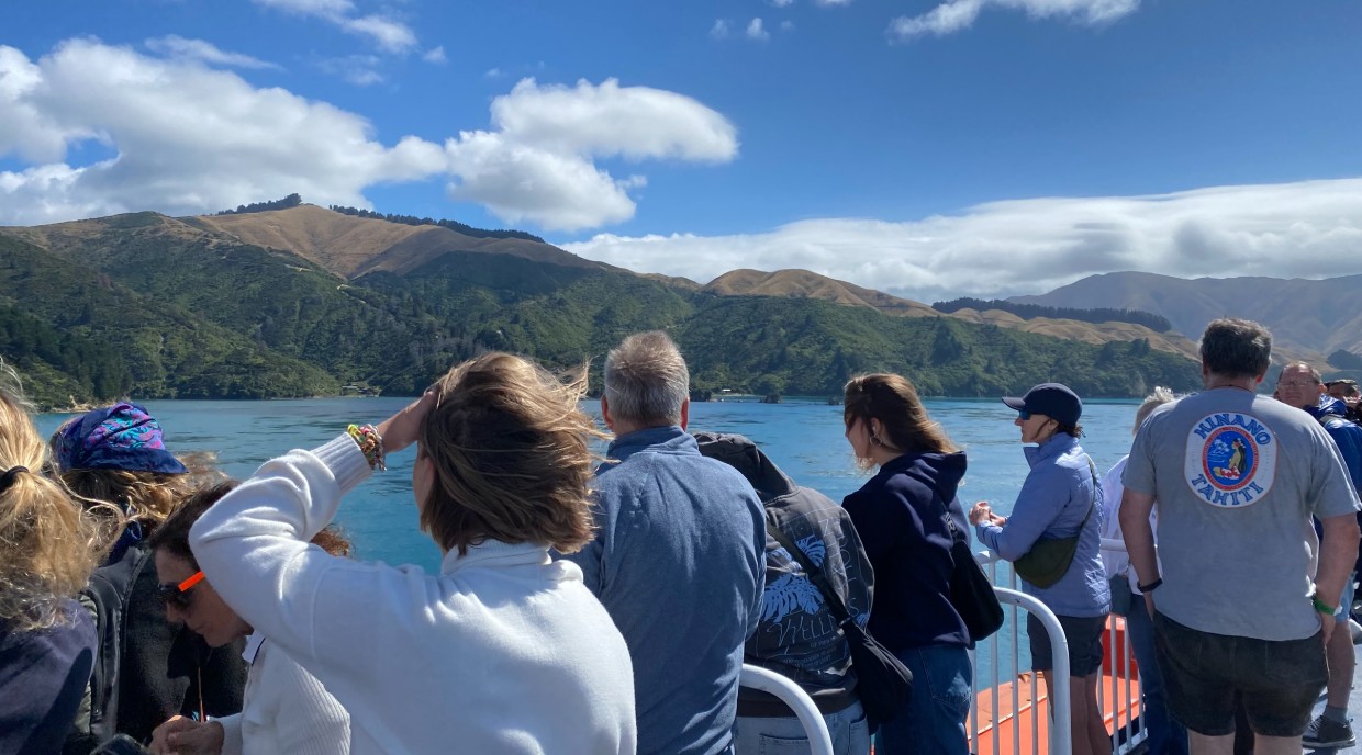 Up on deck crowds crowd on the railings as we enter a most photogenic spot in the narrows. It is amazing especially as the Sun is now shining after we left low cloud behind in Wellington. But more importantly Chelsea are beating The Hammers 2-1 live.