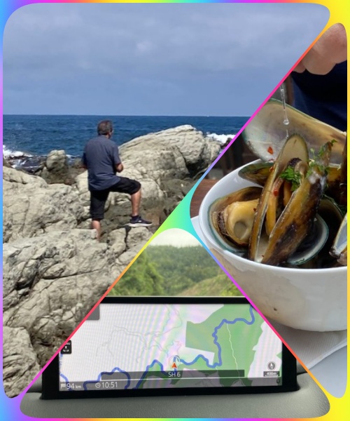 At some points our route is very wiggly as shown on satnav. but then when you get to sea level it does calm down quite a bit. Here we found a very interesting peninsular with strange exposed rocks with groves and small holes in them. Some had metal tags stuck hard into them. Why? Is it to do with Muscle or Lobster fishing? Signs at the car park detail quotas for amateur fishermen, so it could be. Green-lipped mussels are one of the most abundant shellfish around the South Island’s rocky coast. A few found their way into Liz's lunch bowl with a coconut and chilli sauce.