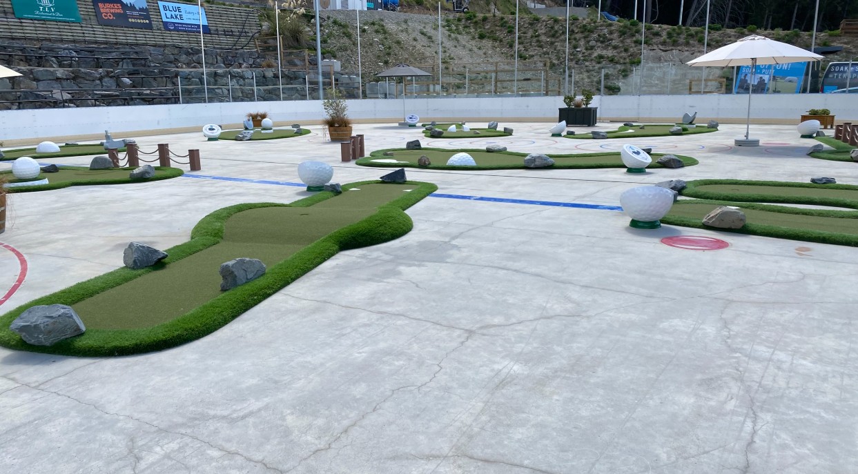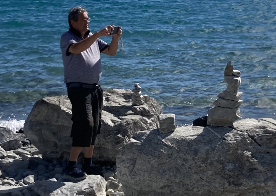 Unbelievable how heavy even the smallest rock is here. Liz made a lovely cairn, photographing it from its best side. Unlike me. We may pop back tomorrow to see it. There is a great walk along the shore here. Today the mini golf was rather straight forward, except for the hole shown, where the hole is on top of a narrow hump and you can so easily windscreen wipe into the region of six shots.