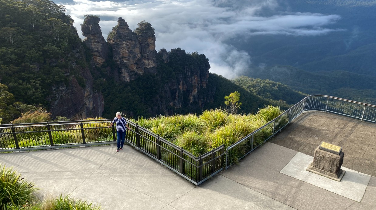 Majestic view of Liz here at Three Sisters, next the monument remembering February 1954 when our Queen viewed from here. We then took Mazzy2 on tour of the route connecting all the view points around here. While Echo Point is built for coaches, we went to several down single tracks, machete in hand, for a quiet and still moment for reflection. Gordon Falls is particularly high and looks out on a carpet of trees as far as you can see. The big road builders are there right now, putting in a coach receiving station at the end of this small residential cul de sac.