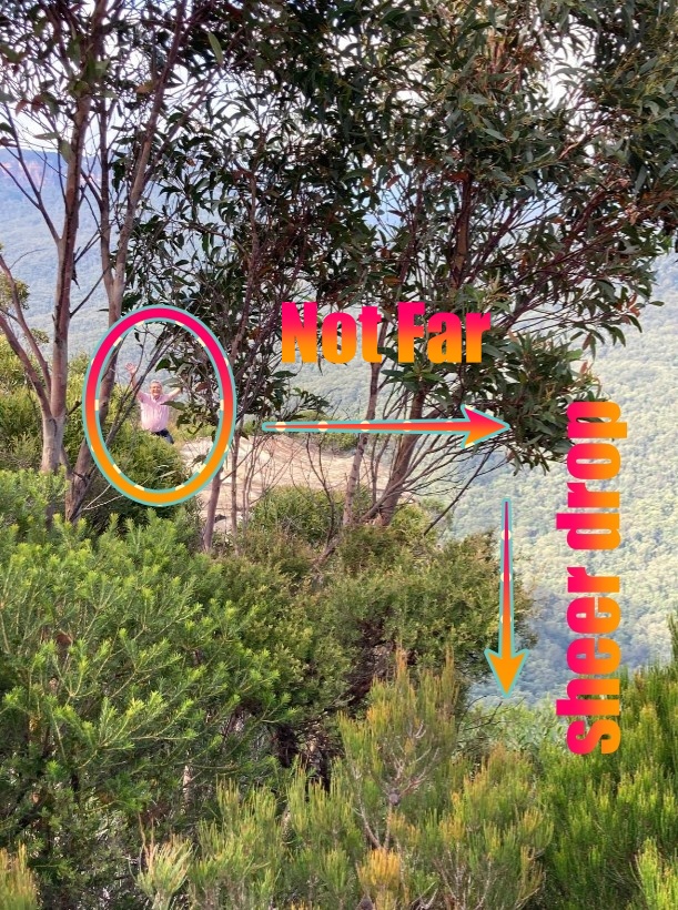 Going off piste at Landslide Lookout you can get to a flattish outcrop of rock unfettered by railings. Probably the highest sheer drop I have ever set foot on. Liz took a picture of me.