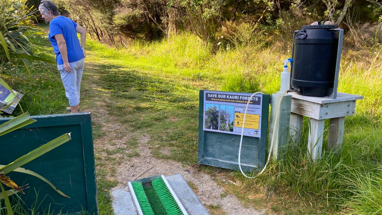 Aboard the Ferry we went on the top deck and it blasted along making it very blowy, but we stayed there, arriving an hour before the first bus. Our map indicated an off-road walk which we found and headed down. It was truely beautiful. Like being in another country. So many different bird calls. Innumerable plants and trees. All so quiet. Then this bicycle drive through cleaning station trying to prevent the plants dying through invasive pollution.