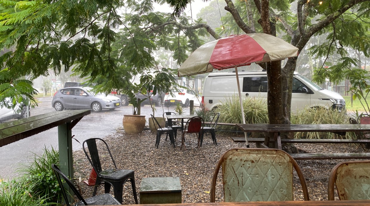 Inundated at last and driven by the cyclone which has been hovering around off the East coast for a while now. Story is it will hit us on Thursday. The white line is the past, the red is the predicted line. For now the only effect seems this rain and some big waves on the beaches. They probably are a result of the strong winds a long way out to sea.