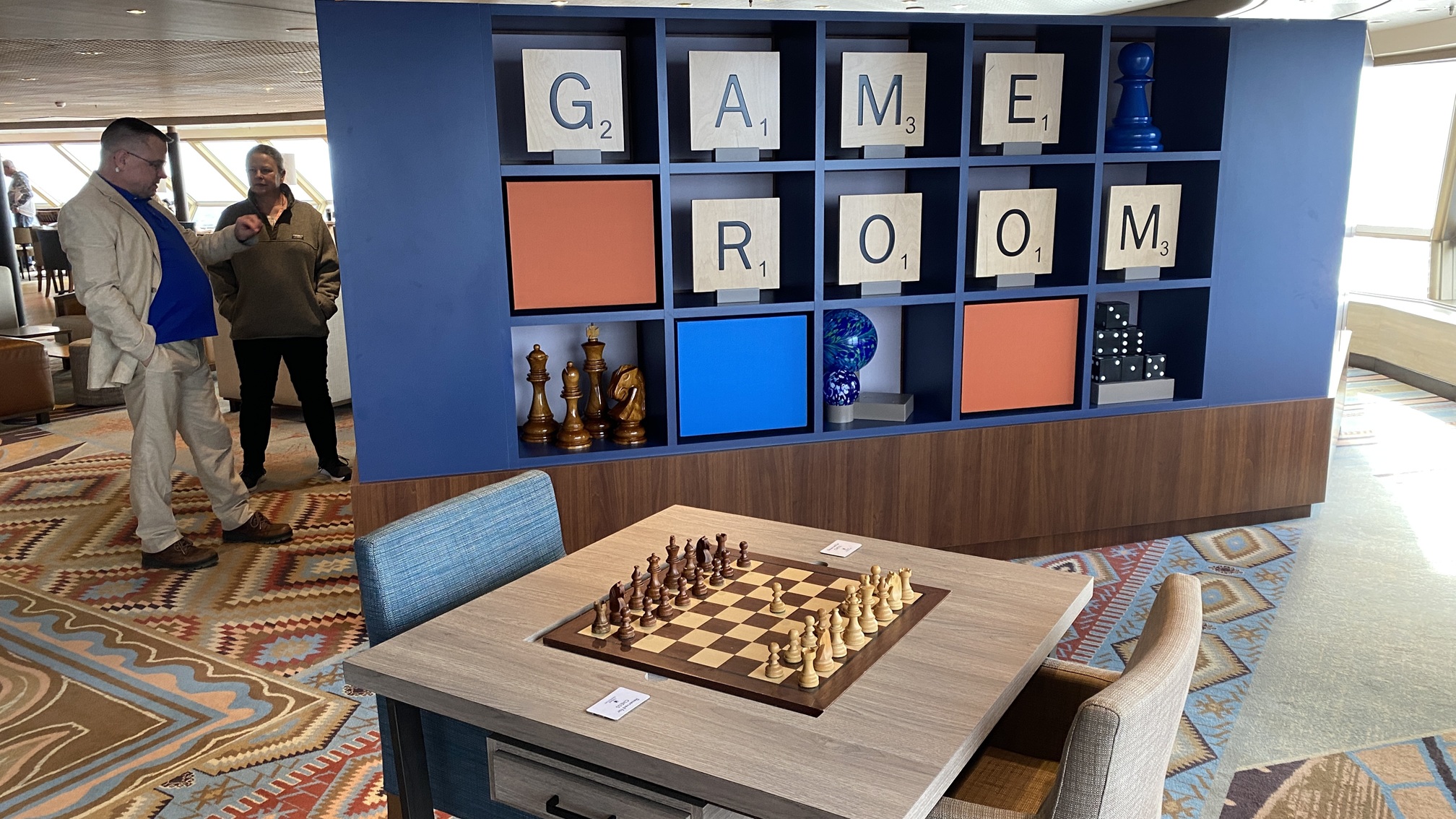 It is wonderful to unpack and to have a base for the next two weeks. For noobs like me, it is a steep learning curve to find the hacks. Thanks to James and Ollie for advice before we left. Other seasoned voyagers are pleased to share too. Failing that, the technology aboard works like a charm. It covers information for everything. One of the best is the carpet in the lift which simply says 'Sunday'.
