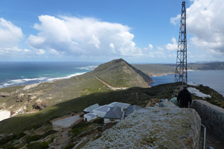From the coach the beaches look wonderful with clear water breaking on white sand, but of course the water is freezing all year around so only surfers venture into it. Fish Hoek Bay is the most dangerous place to swim or surf in the world as far as Shark attacks go. John explains that the recent pursuit of Shark Cage Diving has brought the level of attacks to the current one every three months. These attacks have so far always been fatal. Even if the swimmer gets back to land the shock has been too much. In other areas watchmen sit on high ground able to scan the shallow clear waters and give the alarm. Our destination is the Cape of Good Hope. Simply a romantic point on the map in my childhood;