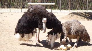 Morning visit to an ostrich farm. These birds can deliver a kick which will rip you open from top to toe with fatal consequences. They are particularly jittery when they have eggs to protect.