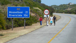 A long but leisurely 500K return to Kaapstad via the pie and other shops. The scenery gradually changes. We drop seven off at the airport and only Hugh and Veronica remain with us for the extension to the Zambia side of the Victoria Falls. The forecast for the amount of water is not encouraging. Perhaps they will be dry. If so we will try to go across to Zimbabwe where there may be some. It is 04:30 now, we leave for Livingstone in fifteen minutes.