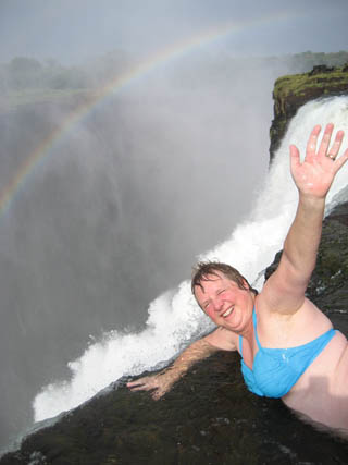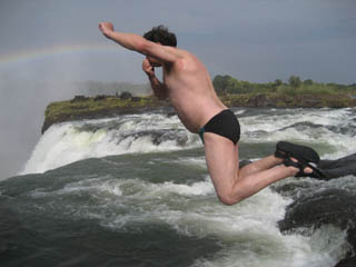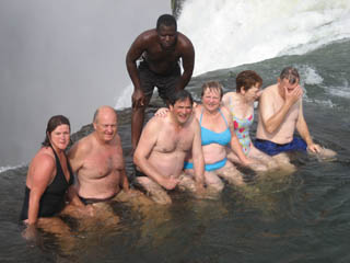 A powerful speedboat takes us to Livingstone Island towards the edge of the falls. We follow our guide David, in single file into the water and swim a path to a rock outcrop on the VERY edge. We all pay careful attention to what David now has to say. We must jump in and about eight feet away from the rocks. He shows us. We follow.