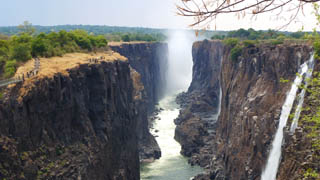 We are soon off again, this time for a sedate viewing along the trail on the other side. The current falls are the seventh cataract. From the trail we can see the sixth where the falls used to be. The eighth is forming and will eventually create a new spectacle. We can just make out the next group going through the routine at the Devil's Pool, at the end of the rocks, just below the branch in the top right of the photo. The recently built Knife Edge Bridge where you can get the best soaking in full flow, can be seen on the left. Zimbabwe is the area in the top left where most of the spray is.