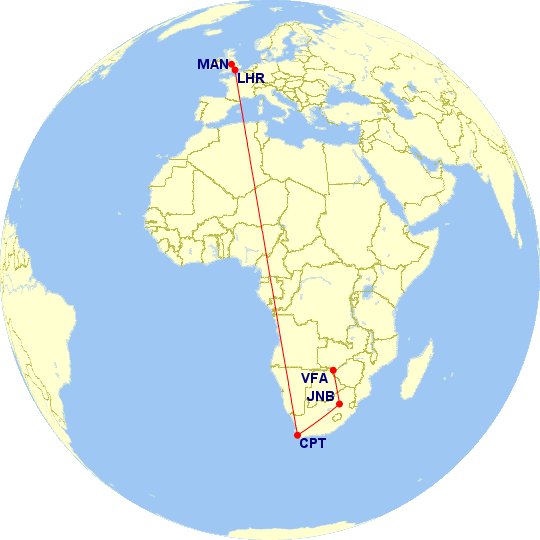 We meet our next guide who takes us across the border to our boatman. It goes smoothly and we meet our final guide for the trip who takes us through imigration and onward to the airport. There is unexpected turbulence over Botswana, but we arrive in Jo'Burg OK. It is a shame to travel by air 90 minutes in the wrong direction. Time passes in Jo'Burg and now we are in the air probably just over Livingstone. I crack open my complementary Malbec and I have time to reflect.