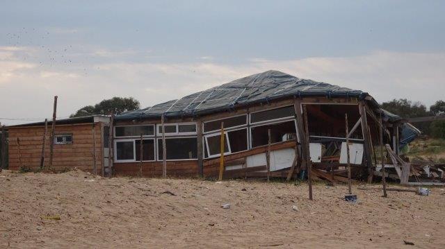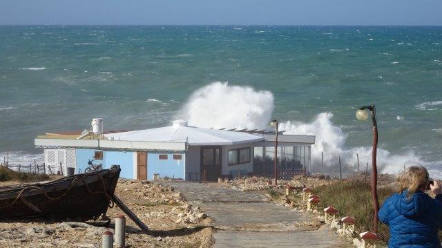 We stroll to the beach where only a few fishermen have standing rods in the sea. There is a 180 degree horizon in the direction of Sicily, the Earth's curvature is stunning. But the beach cafes look as if destroyed by a storm. Walking outside around the hotel walls paints a picture of abandoned desolation and ruin.