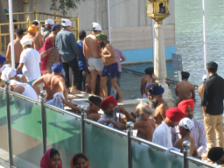 Perhaps this is a trip of a lifetime for them. Despite this Harri our guide says it is unusually quiet and suggests we try to get right into the Golden Temple so we join the queue. Inside a small orchestra, Tabla, Hurdy Gurdy, Sarood plays while several others sing prayers. Visitors scramble to the front and prostrate themselves in devotion. Passing through we turn upstairs where the huge book is kept. This is the subject of the ceremony tonight as every night, when it is moved from the temple into a room. in the main courtyard. Much singing and decoration is required to do this. With the excitement over, we slow down and circumambulate (word of the day) the pond. The occasional Sikh strips off and takes a dip. On exiting the water the process of changing out of the wet underpants to dry ones is an exact ritual which they all appear to have mastered.