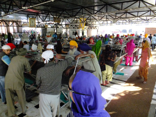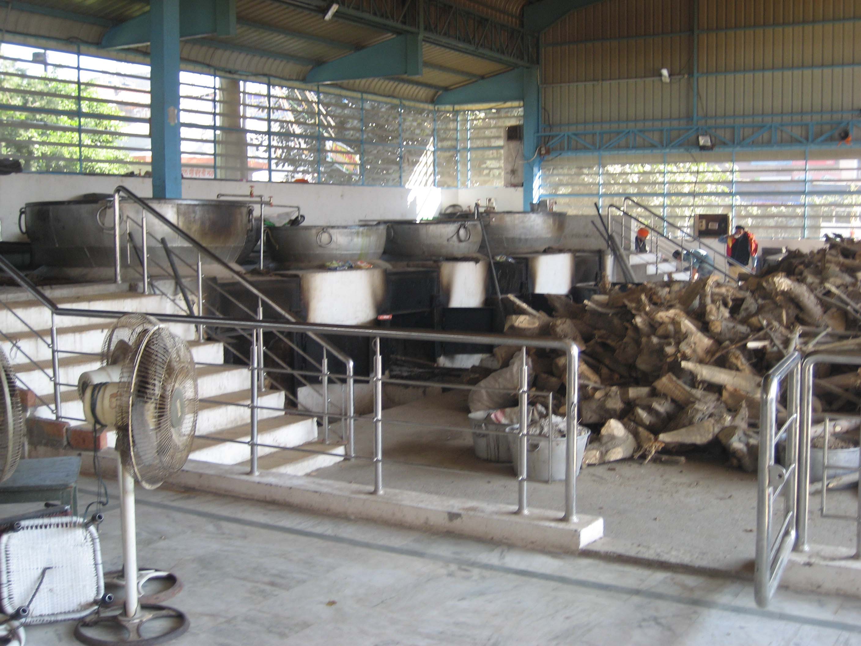 Indeed the queue to visit the temple is very long, but we are here to see the kitchens. The temple provides free meals to anyone and that means continuous service. There are two meal rooms with space for 1000 in each. They file in and get a metal plate with sections in it and a spoon. When one is full they shut the door and service begins. Meanwhile the other room is being cleaned and re set. In the kitchens huge pans are used.