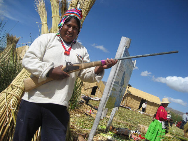 Our day on the lake starts by meeting this chap who lives on a floating island. He shows us his home made rifle which uses home made gunpowder.