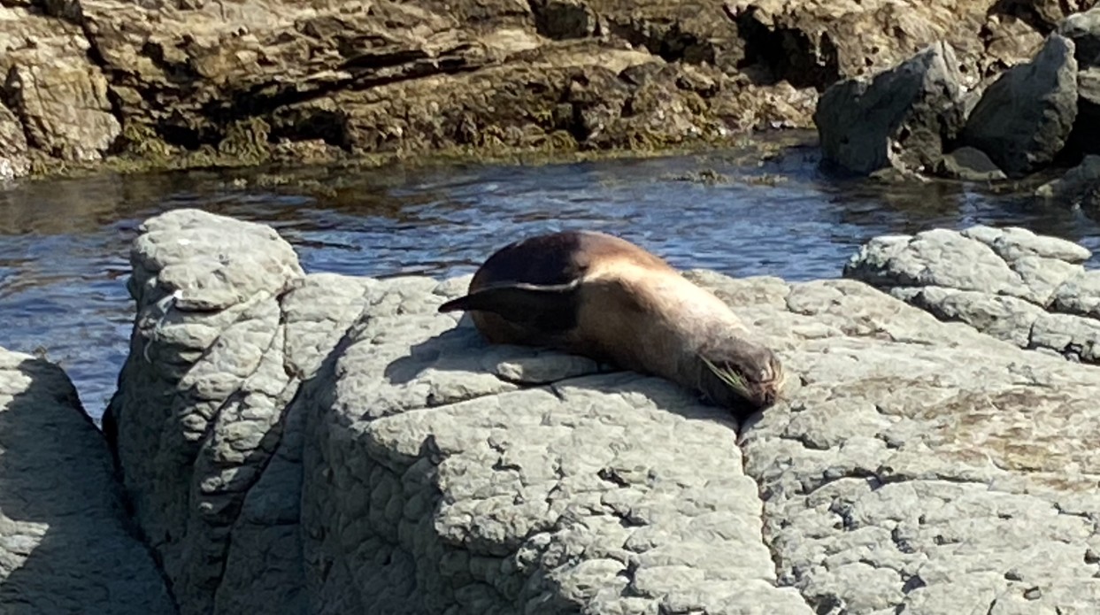 So the tourist must leave their Decaf Tea Bags at home and buy locally? The Donald chips in. Co-Pilot has the last word on the rocks we saw today: The rocks along the Kaikoura Peninsula, especially those exposed by the 2016 earthquake, often have small holes and crevices. These holes are typically formed by marine organisms like mollusks and barnacles that bore into the rock, as well as natural weathering processes over time. A seal rolls around on the rocks laughing.