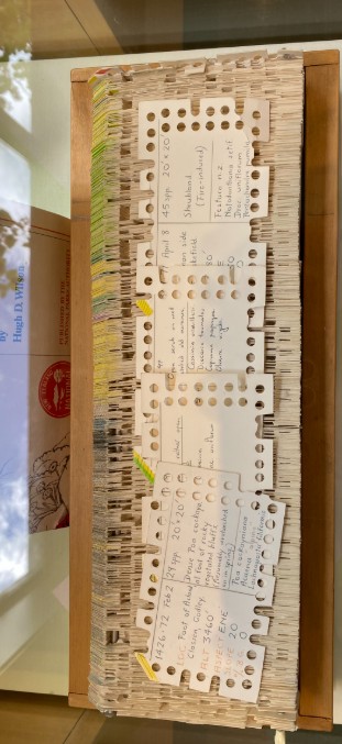 Do you see how it worked, if I tell you there was a metal rod, longer than the box? Yes, slide the rod into one of the holes and lift it out. Some cards would stay in the box, others would be skewared by the rod. So an eary sort of sorting mechanism. Further sorting was possible by turning the cards over and either replacing them in the box or just further sorting on those in hand. Some sides seem to have been coloured. Perhaps you could rest everything using that. What a masterpiece.