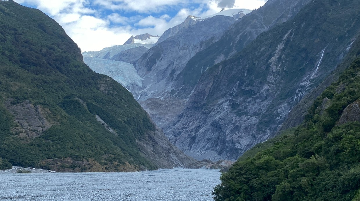 Pulled over on route to Franz Joseph Glacier to see a waterfall which was trickling into a small river. But the evidence of the river bed shows how huge and ferocious the river will be in Winter covered in rocks. The most beautiful cairns have been built on this huge tree leaving no space at all for new ones. But we did manage to place a tiny stone on top on one as our contribution. It is amazing to come across these things by chance.
