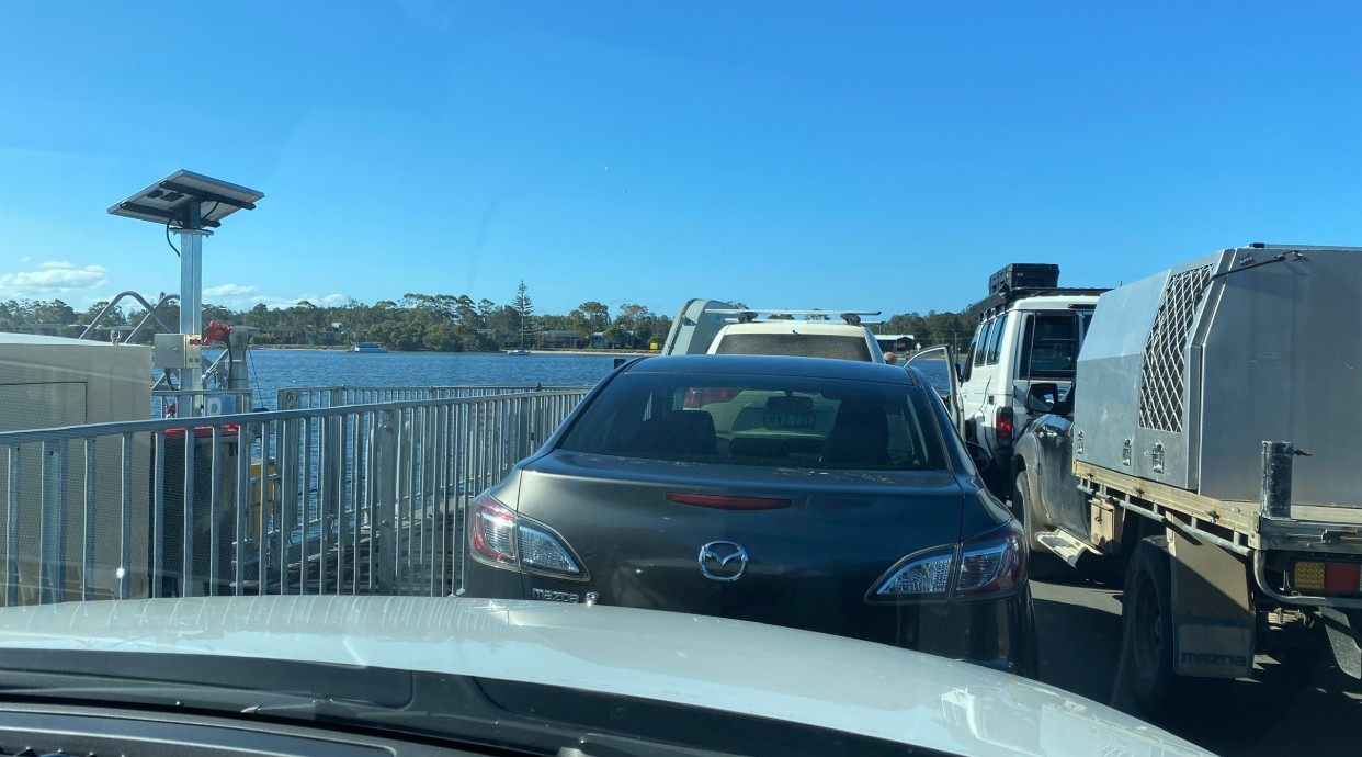 Valet service for Mazzy2 badly needed after trip to beach involving actually going into the sea. Wonderful surf and not at all cold. However now substantial sand transportation is in progress. We continued on our way looking for a beach that would be 'just the right sort of sandy sheltered rocky bay with a cafe'. While so doing, we came across a ferry which we decided to take Mazzy2 on. This cost nothing! So now we are driving around somewhere else without any beaches. Ooops, it is 50k to the next ferry to get home, we have to turn around and get the same one back. This of course costs $8. Ferry operators were not born yesterday. But Mazzy2 enjoyed cooling off on the river for a while.