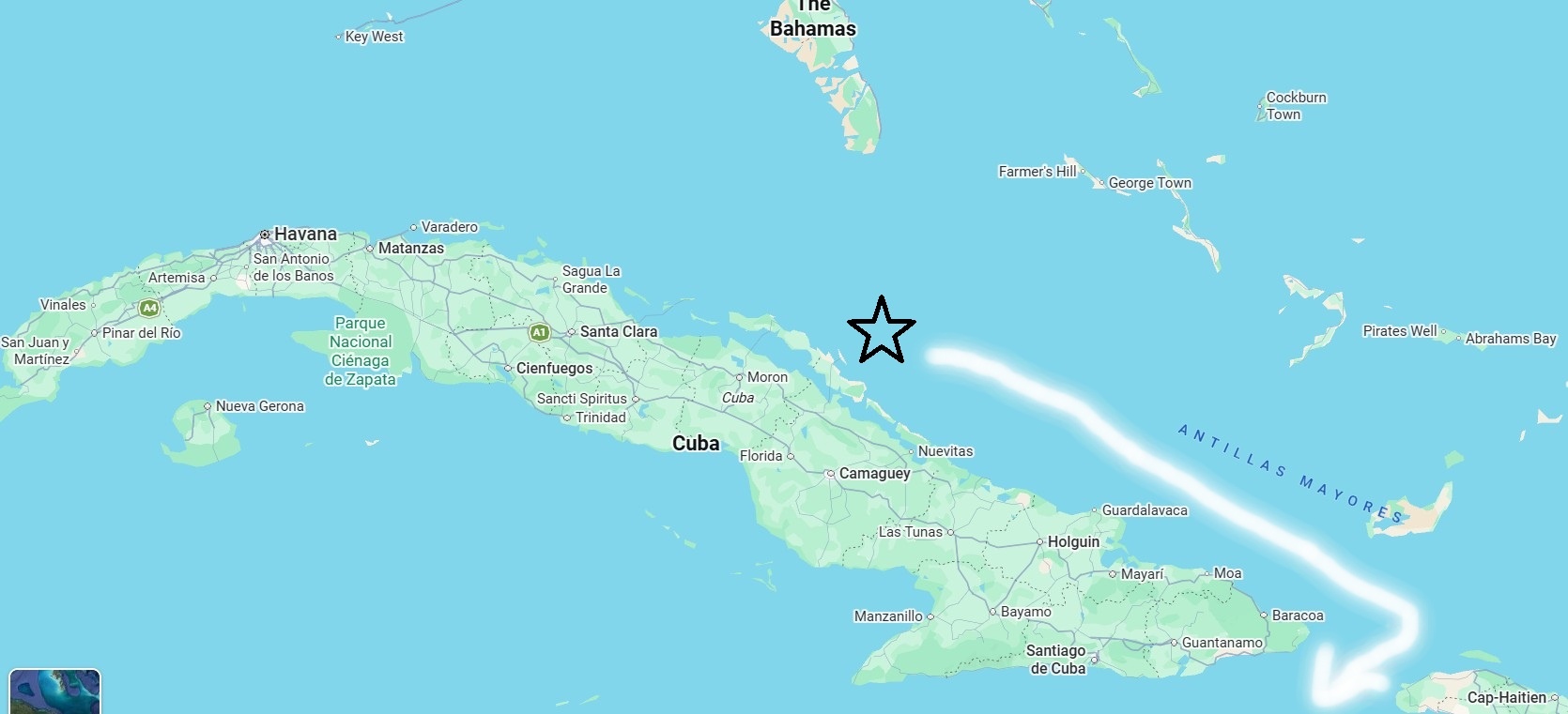 Pre-dawn position check 21N 75W, Sailing ESE. My plan is to hang a right and take the Windward Passage between Eastern Cuba and Northwestern Haiti. Meanwhile, at a beautiful table starboard side, PBJ toast for breakfast while Cuba passes by on the horizon.