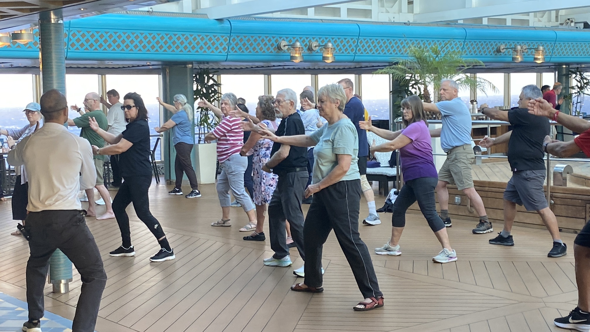 Sunrise position check N17 W74. You can see we are crossing the Zuiderdam's path from its previous voyage on 20th January. We wave goodbye to our close companion, 'Carnival Horizon', as it turns Southeast for the next four days visiting Aruba, Bonaire and Curacao in quick succession. Meanwhile after breakfast daily Tai Chi.