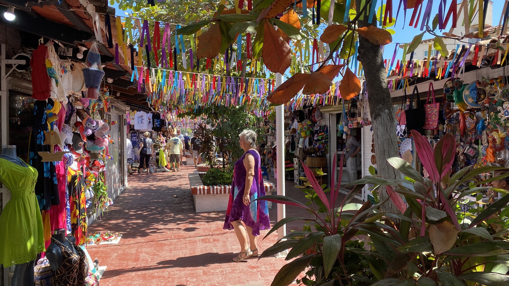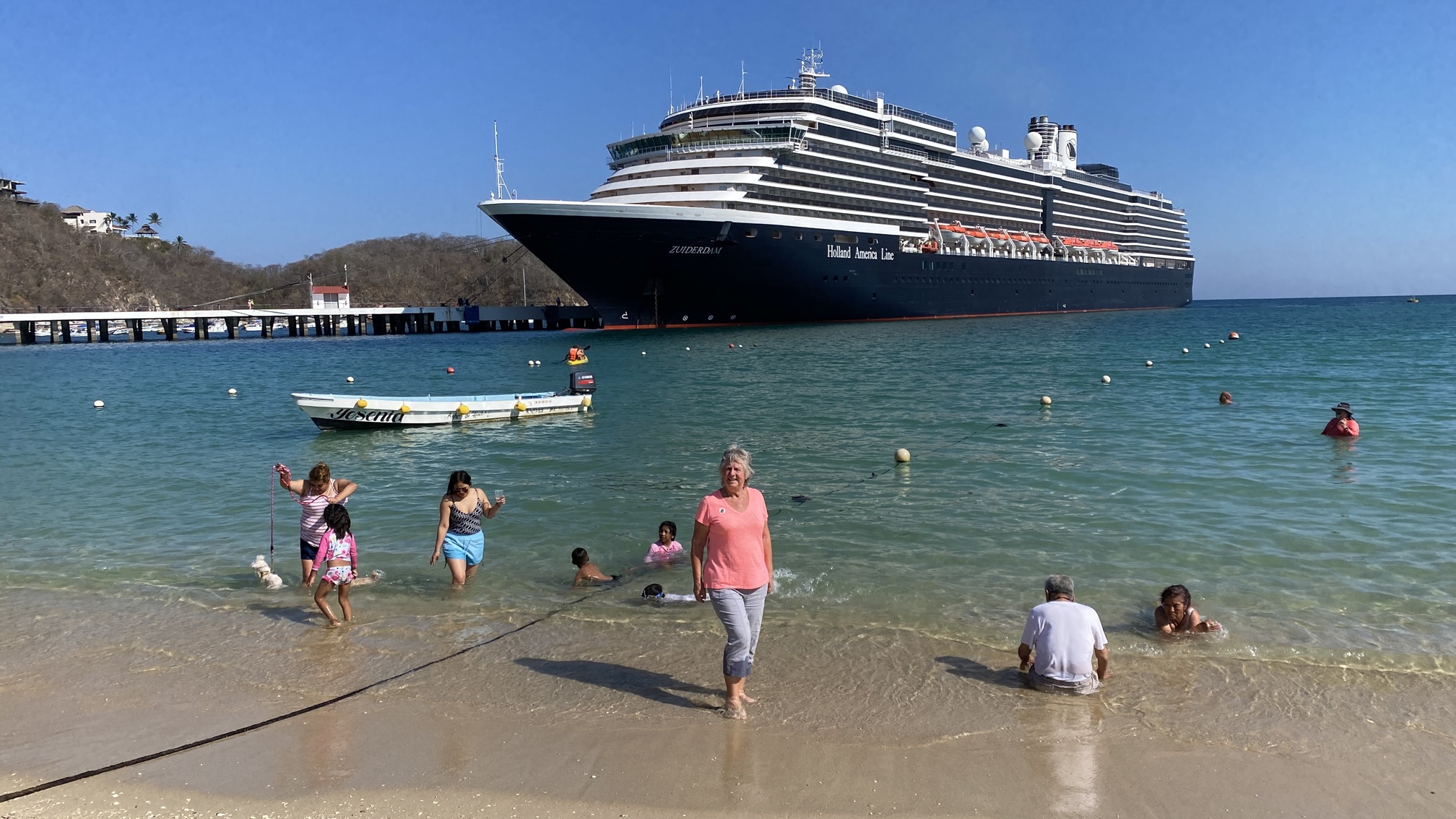 Our tour ends at a restaurant and we have a quick guacamole mixed at the table by an animated Mexican lady. Honestly, I have never seen an avocado smashed quite like that before. Then we regrouped on the ship, before going ashore to the port area for a shopping trip. Nothing was purchased on this occasion, but you must admit Liz's colourful camoflage is a winner.