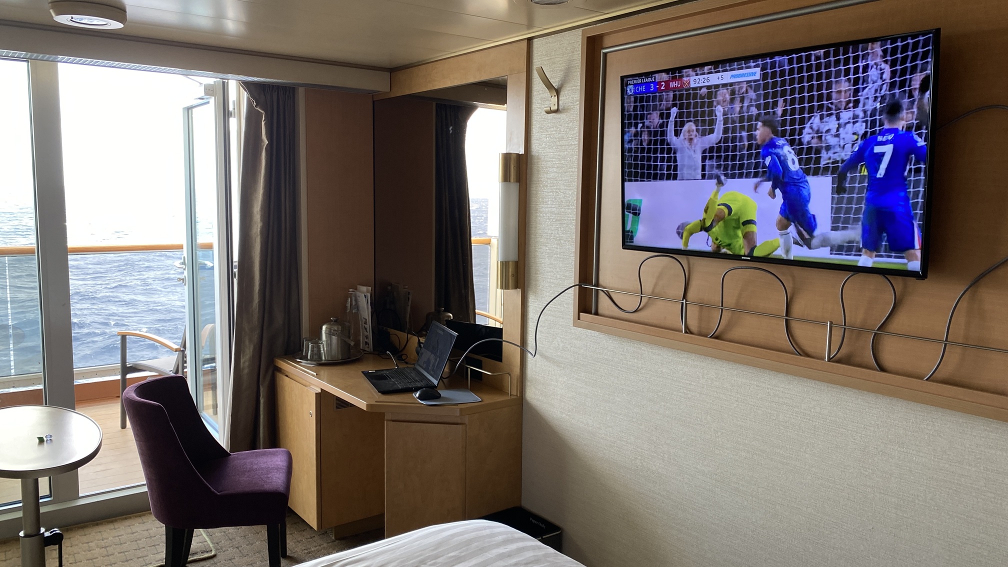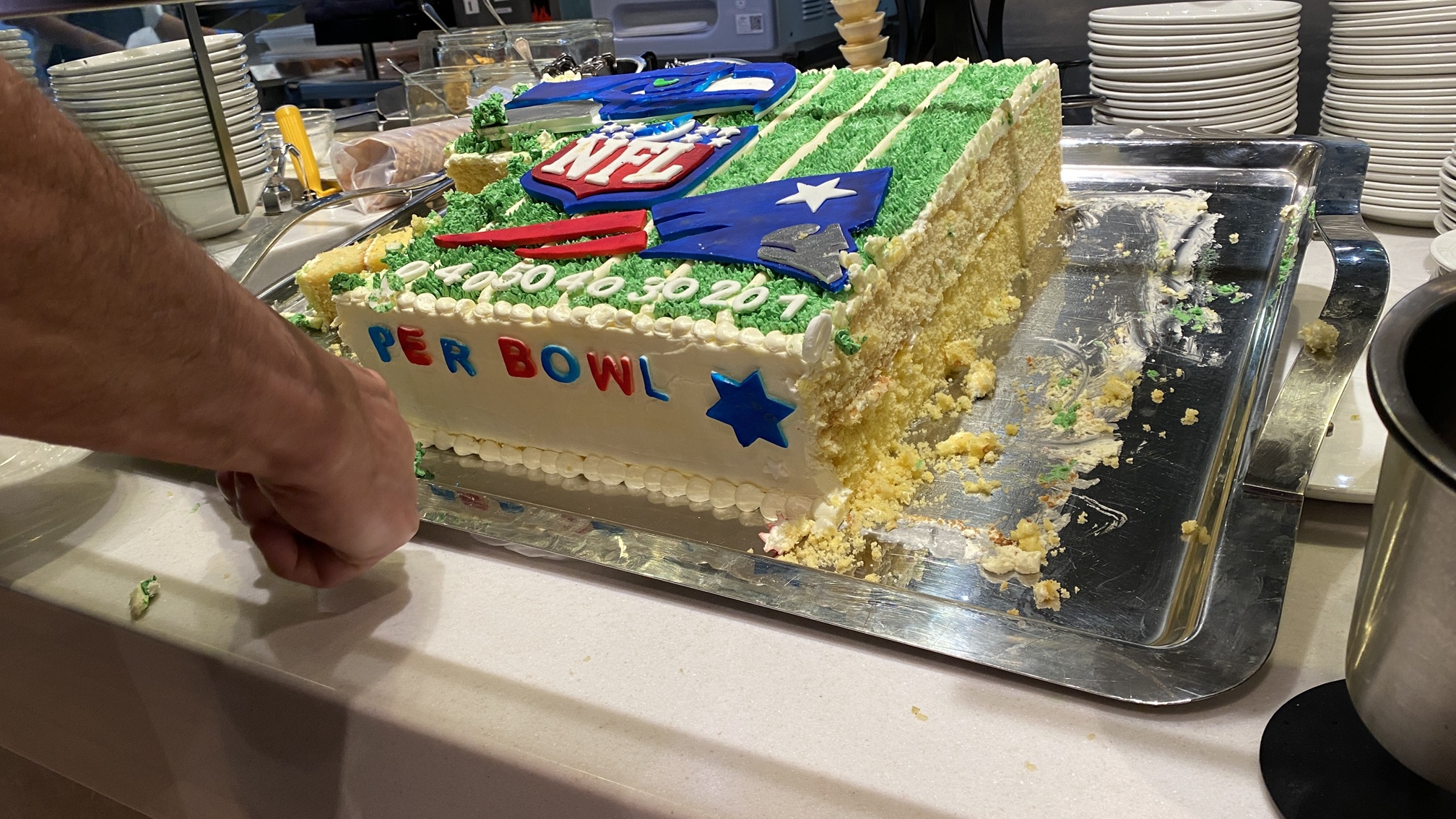 Watched the pre-match business and the first quarter of Superbowl LX in the almost full main theatre with the real fans. Ship provided seat service of popcorn, drinks and mini burgers.