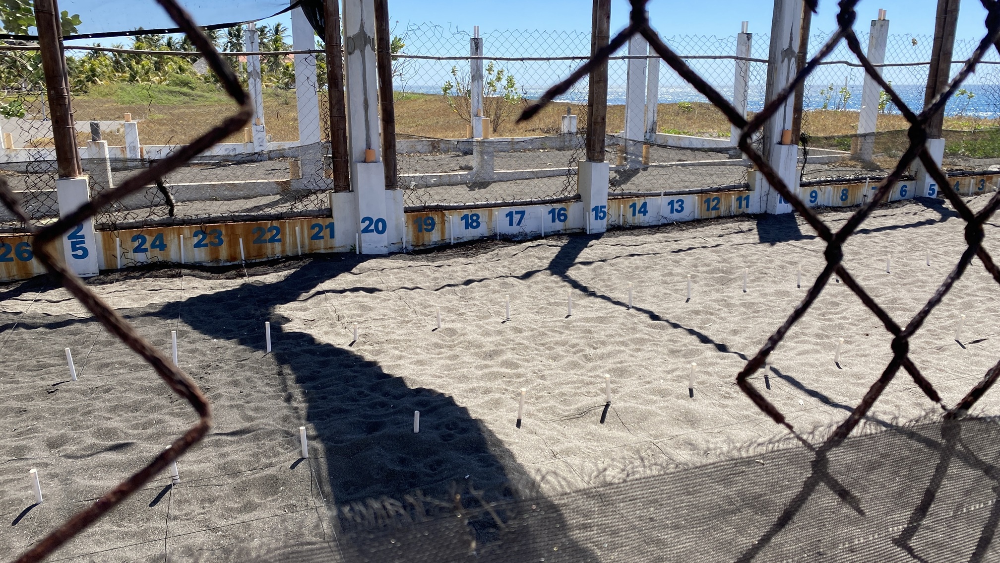 They use a co-ordinate system to keep track of where the eggs have been laid. The fence around is only two years old, but the harsh sea winds and Sun have rusted it away already. Plastic will be the replacement.